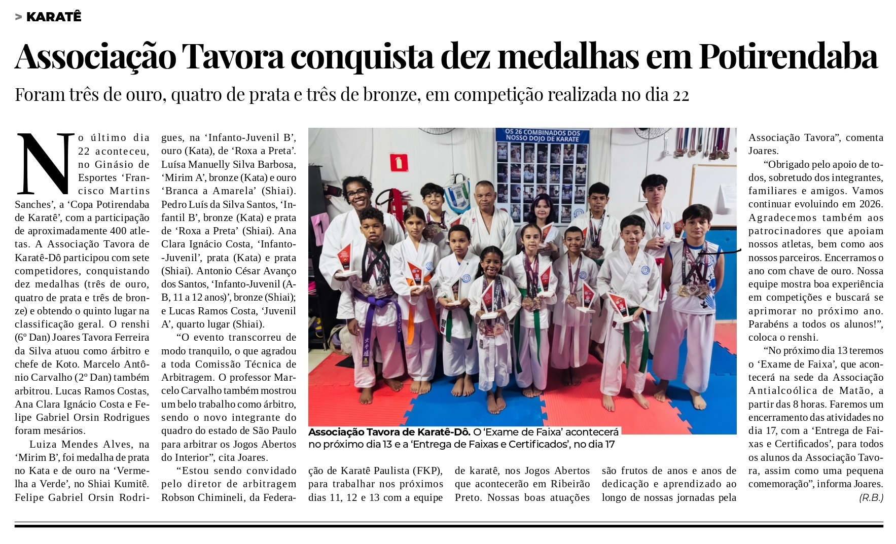 No último dia 22, aconteceu no Ginásio de Esportes ‘Francisco Martins Sanches’, a ‘Copa Potirendaba de Karatê’, com a participação de aproximadamente 400 lutadores. A Associação Tavora de Karatê-Dô participou com sete atletas, conquistando dez medalhas: três de ouro, quatro de prata e três de bronze, perfazendo o quinto lugar na classificação geral.